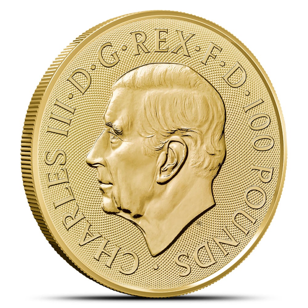 The obverse of 2025 British Gold The Lion and The Eagle Coins comes with a depiction of His Majesty King Charles III. This portrait of Charles III offers a left-profile relief without a crown included on His Majesty’s head. This design was created for The Royal Mint in late 2022 by Martin Jennings.
