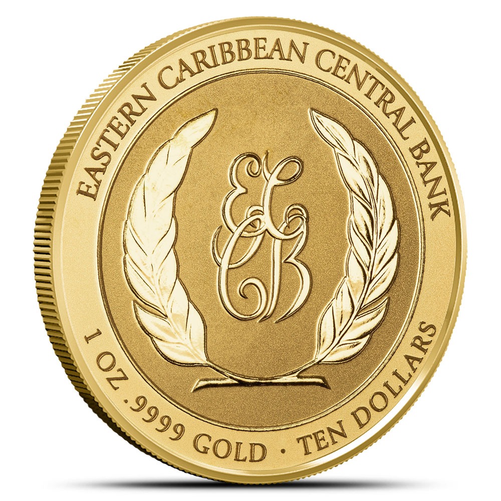 For the obverse of 2024 1 oz EC8 Gold Flamingo Coins, you’ll find the simple logo for the Eastern Carribean Central Bank. It consists of the initials ECCB flanked by large laurel branches. The Eastern Caribbean Central Bank (ECCB) serves as the monetary authority for eight member countries in the Eastern Caribbean Currency Union. Established in 1983 and headquartered in Basseterre, St. Kitts and Nevis, the ECCB issues and manages the Eastern Caribbean dollar, which has maintained a fixed exchange rate of EC$2.70 to US$1 since 1976.
