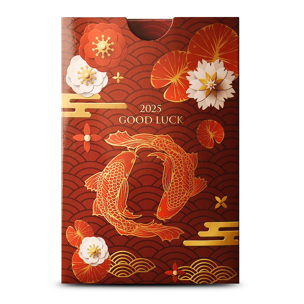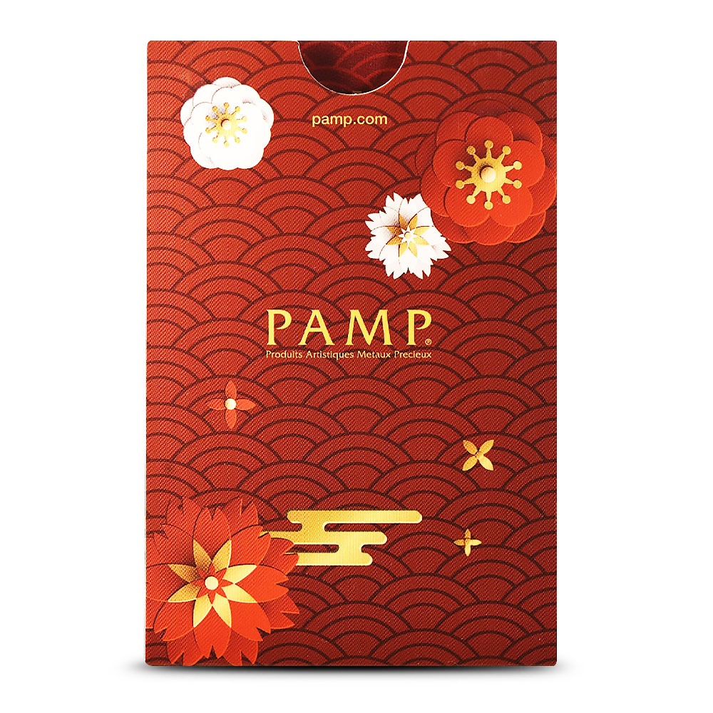 Each of the 2025 1 oz PAMP Suisse Good Luck Koi Fish Gold Bars available here is individually packaged by the refiner. The bars are sealed inside protective plastic and surrounded by a themed assay card. The red-and-gold assay card features floral patterns similar to that of the bar and includes the same emblem of koi fish swimming in a circle. The back of the assay comes with authenticating information for the bar.