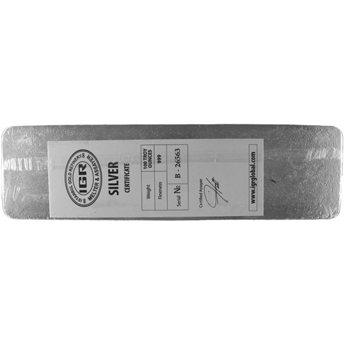 Previously, IGR had issued its Good Delivery cast silver bars in weights of 5 oz, 10 oz, 250 Gram, 500 Gram, and 1 Kilo (1000 Gram). The introduction of these massive 100 oz silver bars gives investors the opportunity to purchase in one bar the equivalent of more than three of its 1 Kilo silver bars. As with other cast silver bars from IGR, these bars have inscriptions stamped incuse on the obverse. Incuse strikes set the identification markers beneath the surface of the silver bar.