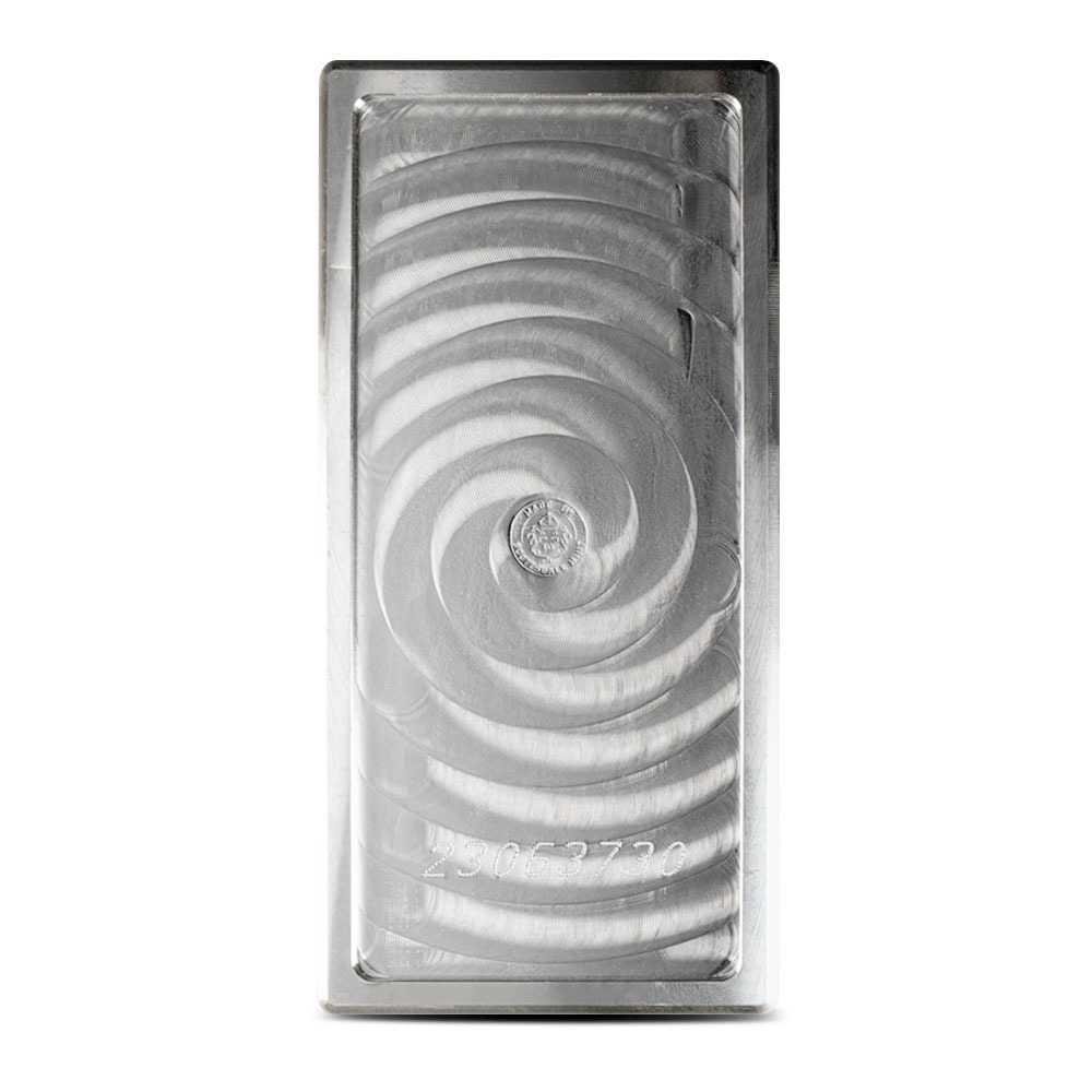 On the reverse side of 100 oz Stacker Silver Bars, you will find a beautiful design element. Though there are no inscriptions on this side of the bar, you will notice the swirling pattern that starts at the center and emanates out to the edges of the field.