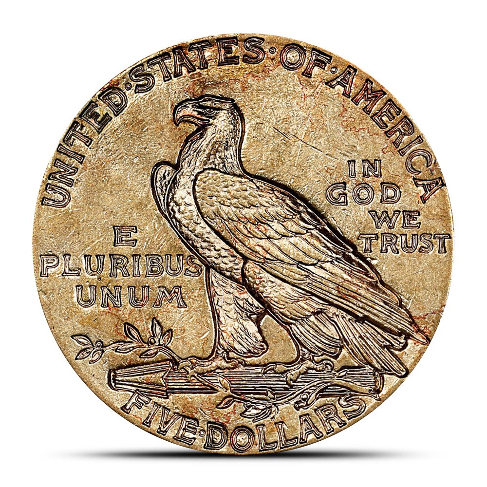 For the reverse side of 1911 $5 Indian Half Eagle Coins, Pratt created the image of an American bald eagle. Balancing power and peace in his design, Pratt shows the eagle in left-profile relief with its wings at its sides as it sits perched on a sheaf of arrows. An olive branch is wrapped around the sheaf of arrows to offset the symbol of military might with one of peace.