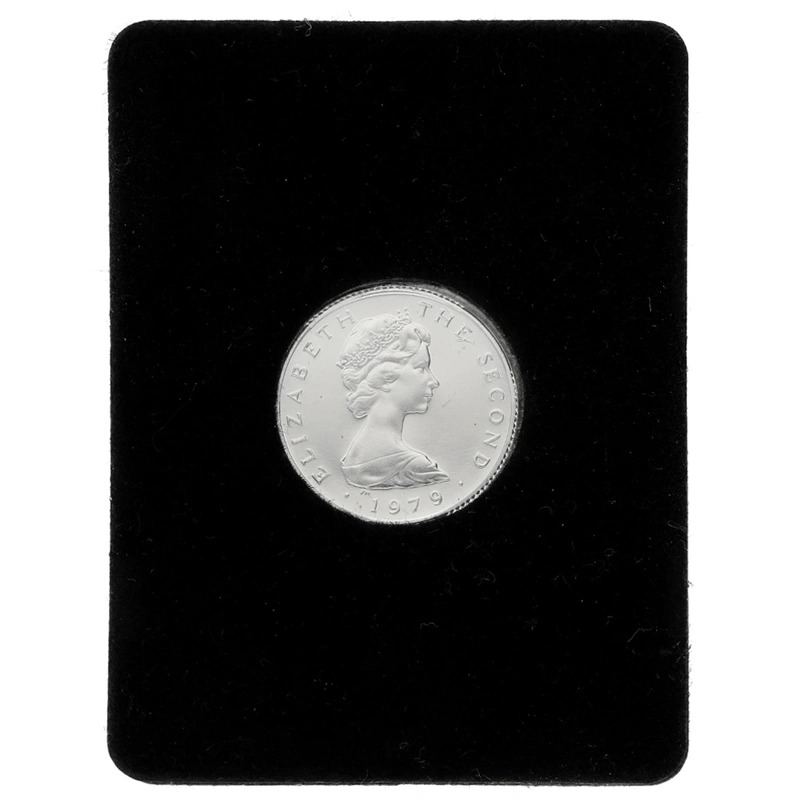 This 1979 platinum Proof one pound coin features the threelegged Triskelion over the outline of the Isle of Man and the portrait of Elizabeth II. Text reads ISLE OF MAN ONE POUND. Boxed with certificate.