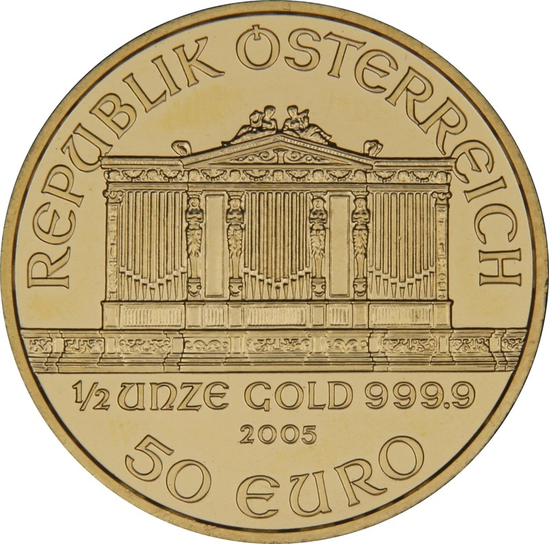 The 2005 1/2oz Philharmonic is an Austrian gold coin, minted by the Münze Österreich. The weight of the coin is 15.55 grams with a fineness of 999.9 (24 carat gold), this means it contains 15.55174 grams of pure gold. The diameter of the coin is 28 mm. The 1/2oz Philharmonics have a face value of 50 Euros and are legal tender in Austria.