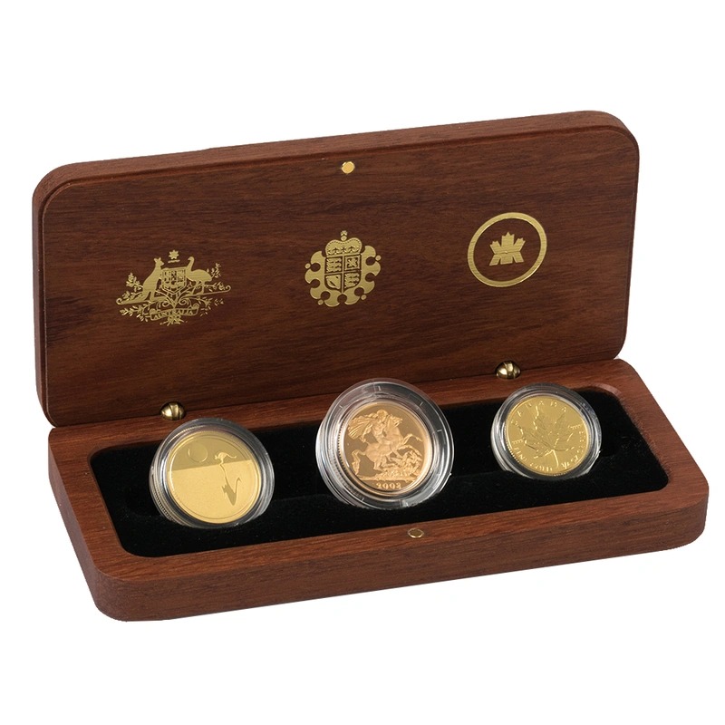 The exclusive set features the signature gold coins of each nation including: the Royal Australian Mint’s 1/5 oz 24 ct Kangaroo at Sunset; the Royal Mint‘s 1/4 oz 22ct St George Sovereign; and the Royal Canadian Mint’s 1/4 oz 24 ct Gold Maple Leaf.