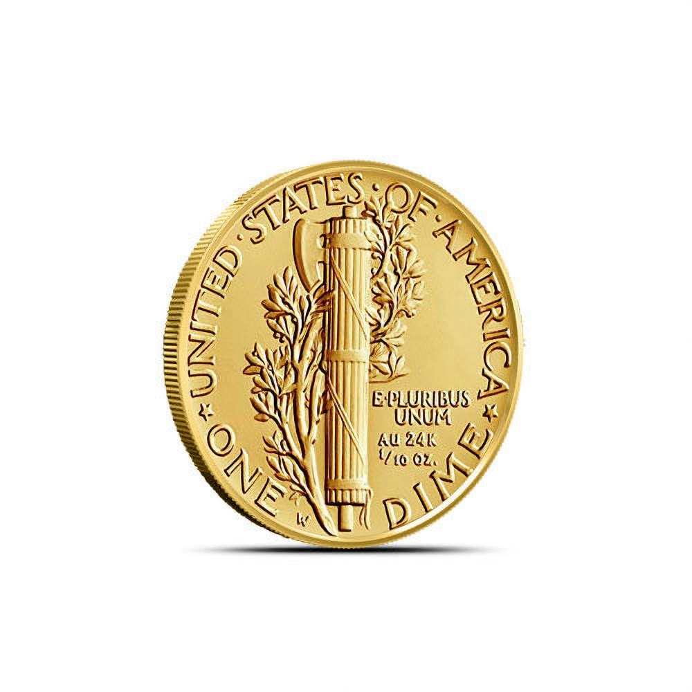 Each of these coins, struck by the United States Mint’s West Point Mint facility, contains 24-karat gold in a weight representative of its original size and face value. In this case, it is a 1/10 troy oz. coin to replicate the original Mercury Dime.