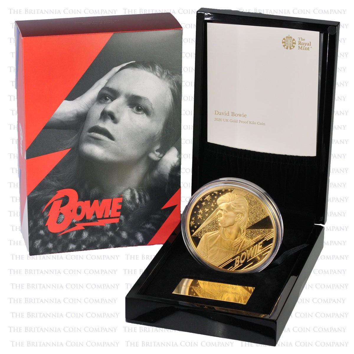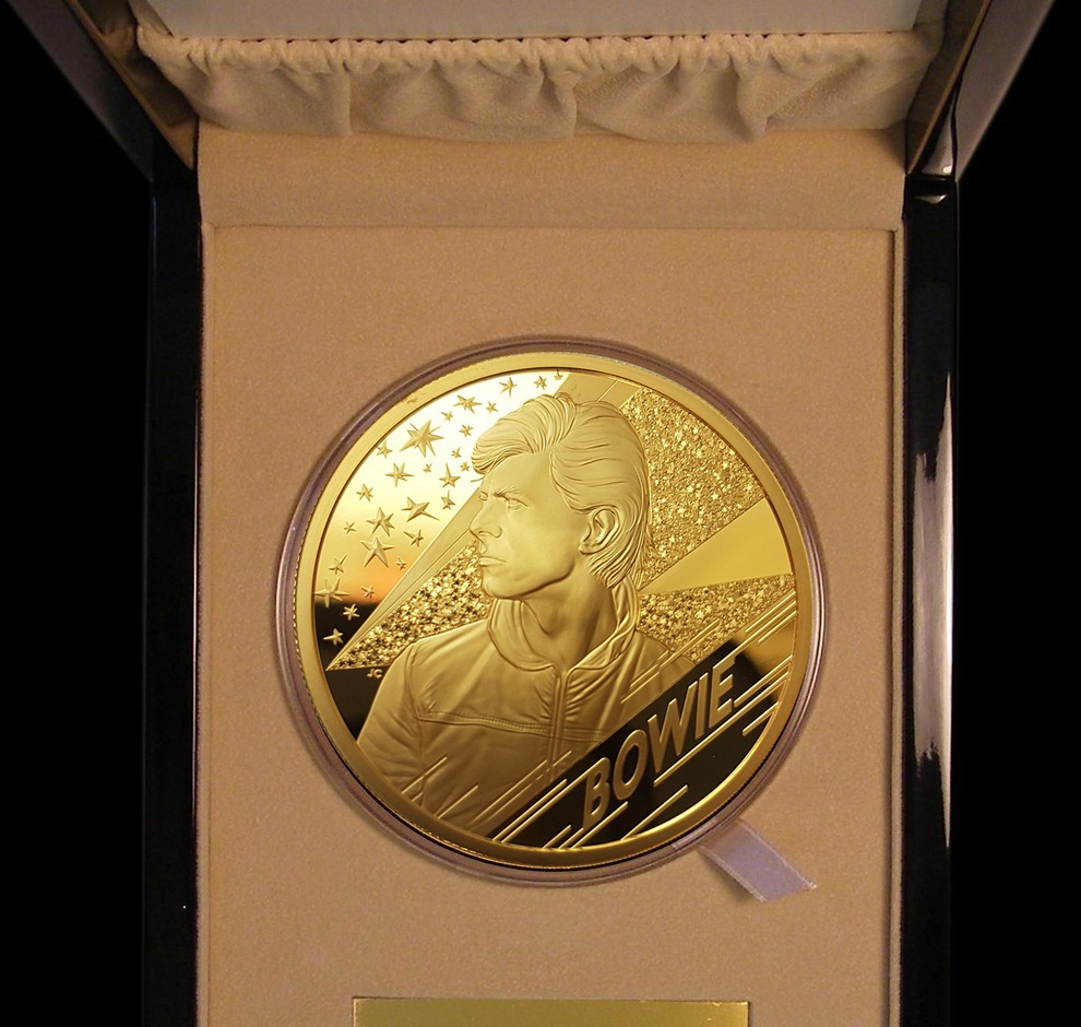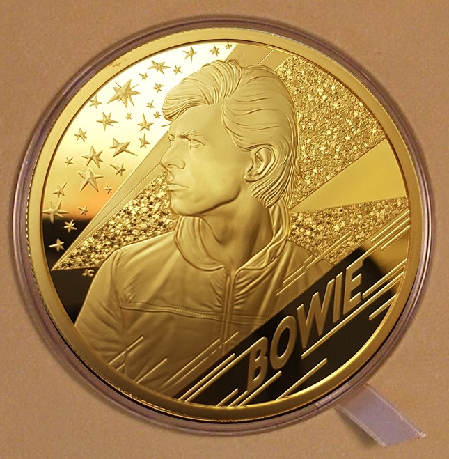 We have been able to secure just one piece of the highly sought after and ‘sold out’ David Bowie ‘One Kilo’ gold proof version. One of just 11 struck for worldwide distribution. The 1 Kilo version was originally due to be released on Bowie’s birthday 8th January following on from the hugely successful and also sold out 1oz version. COVID delays meant the official release date became 23rd January 2021. The 2oz and above denominations design differs slightly from the previously issued coins, the lightning bolt appears laced with stardust to create a glitter effect.