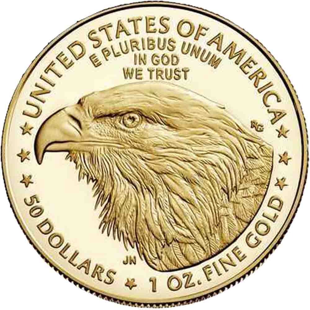 An American bald eagle is found in the reverse field of the 2023 1 oz Proof Gold Eagle Coin. This image was recently introduced to the series in 2021 as part of the 35th anniversary of the series. Designed in 2020 by Jennie Norris, it is now the new standard reverse design for the collection.
