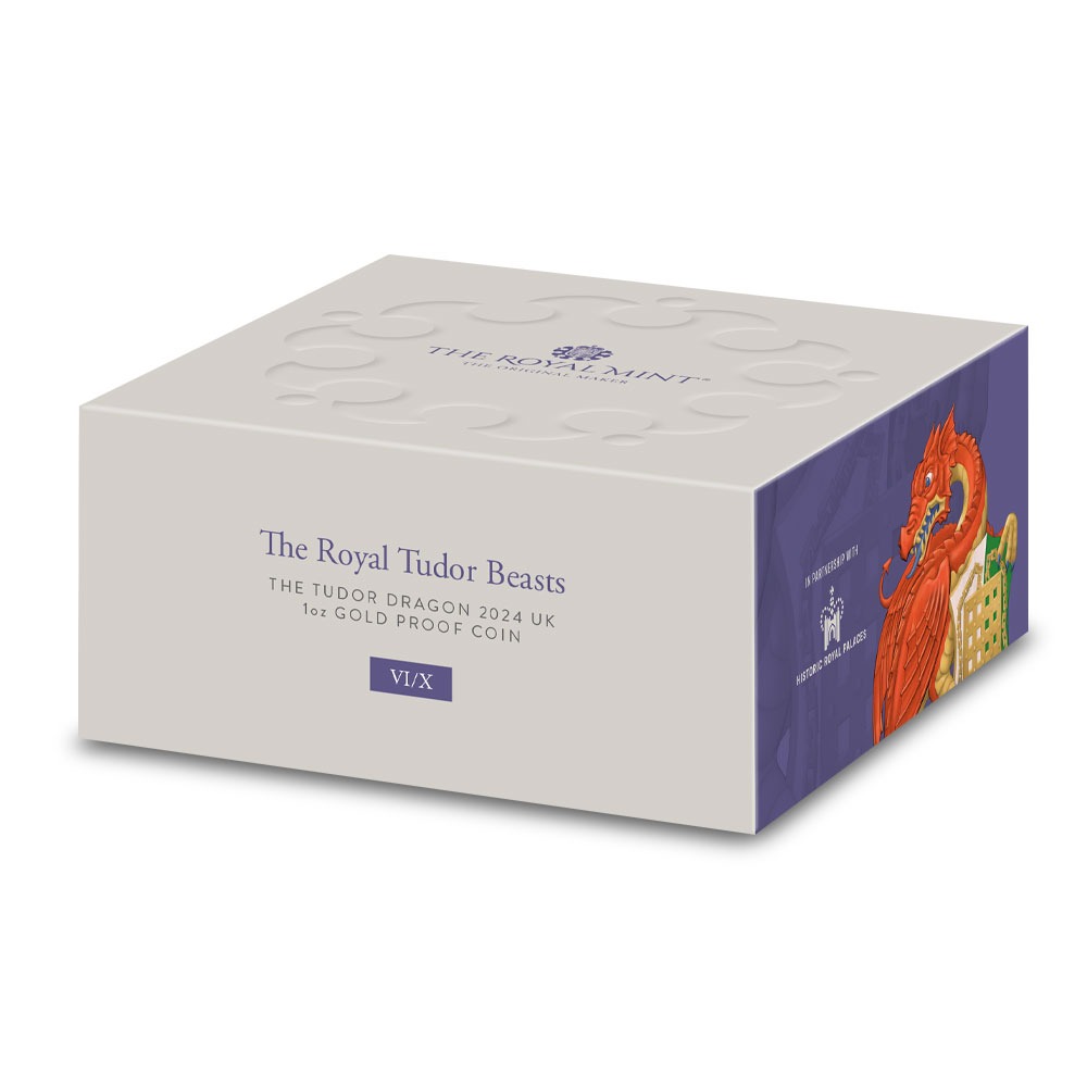 Each of the 2024 1 oz Proof British Gold Tudor Beasts The Tudor Dragon Coins offered here comes with individual packaging. The 1 oz gold coins are housed in capsules and packaged in wooden presentation boxes. The boxes ship inside a Royal Mint shipper with a Certificate of Authenticity included.