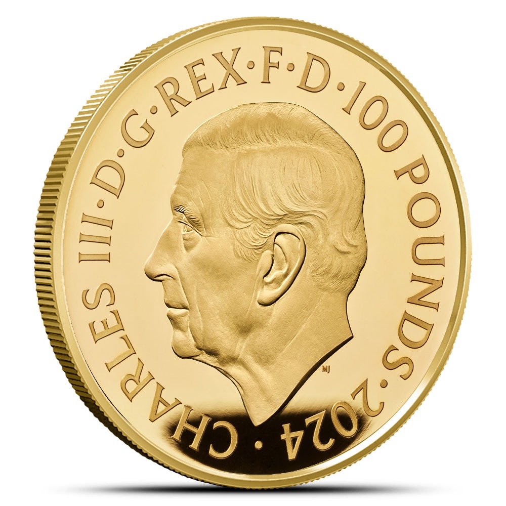 On the reverse side of 2024 1 oz Proof Gold Tudor Beasts The Tudor Dragon Coins, you’ll find the image of the Tudor Dragon. Designed to reflect the connections of the Tudor Dynasty to their Welsh heritage, the dragon is shown supporting a shield with the Beaufort Portcullis badge emblazoned on it.