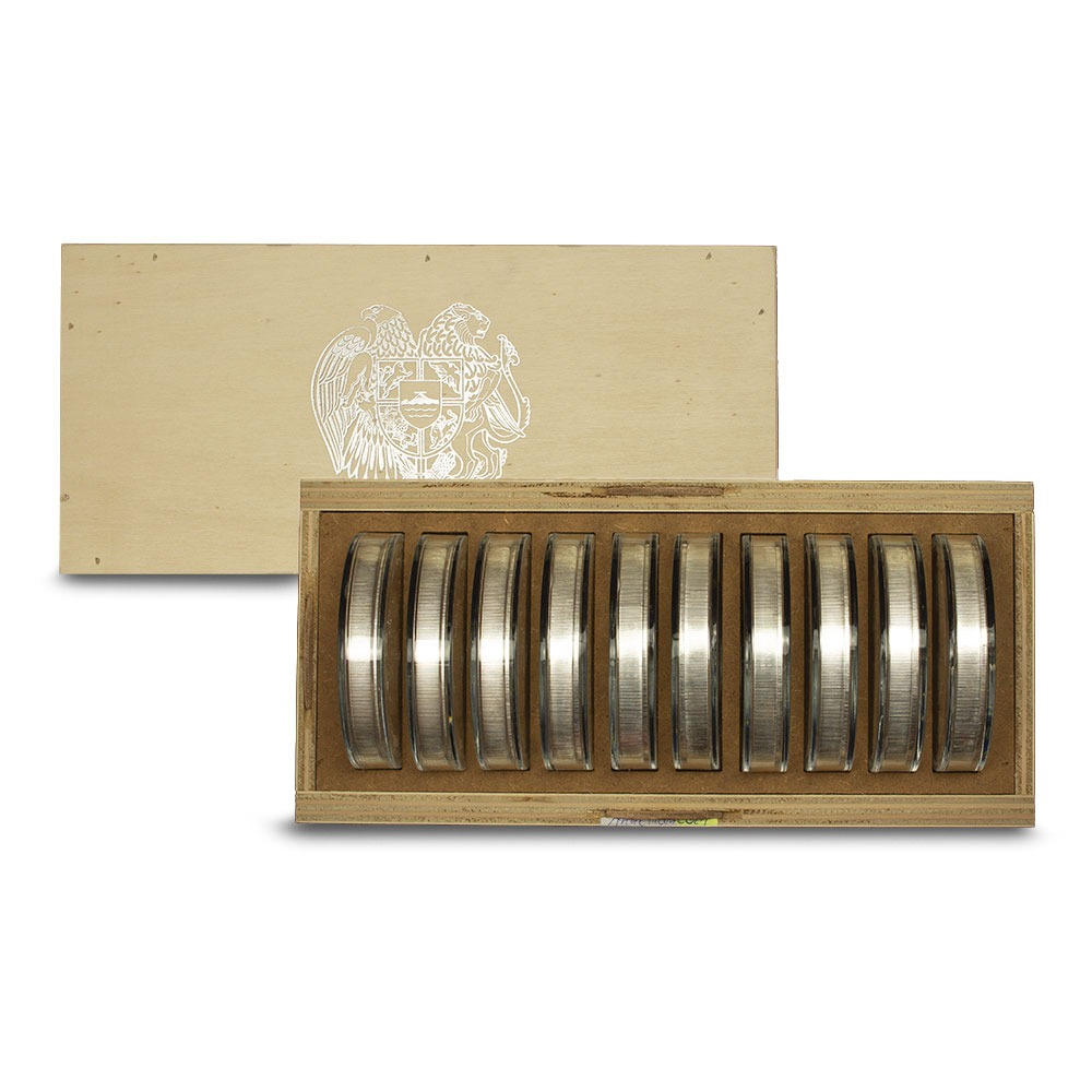All 2025 1 Kilo Armenian Silver Noah’s Ark Coins come in Brilliant Uncirculated condition. Individual coins are housed in protective plastic capsules, while bulk purchases are offered in boxes of 10 coins, with each coin still sealed in its capsule.