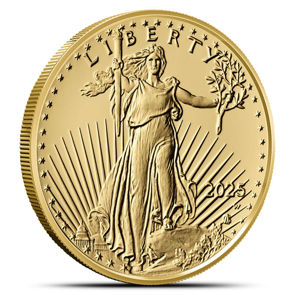The obverse of the 2025-W Proof American Gold Eagle highlights Augustus Saint-Gaudens’ 1907 depiction of Lady Liberty walking forward, holding a torch and an olive branch, with sun rays and the U.S. Capitol Building in the background.