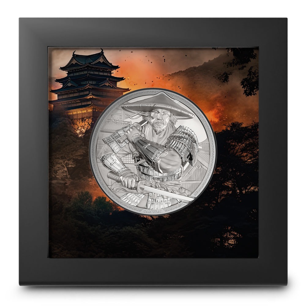 All 2025 5 oz Proof Cook Islands Silver Samurai Coins are available in presentation window boxes. The box has a themed background with flames surrounding a feudal Japanese castle. The coins are proof specimens with frosted designs and mirrored fields, as well as an ultra high-relief strike that delivers greater 3D relief.