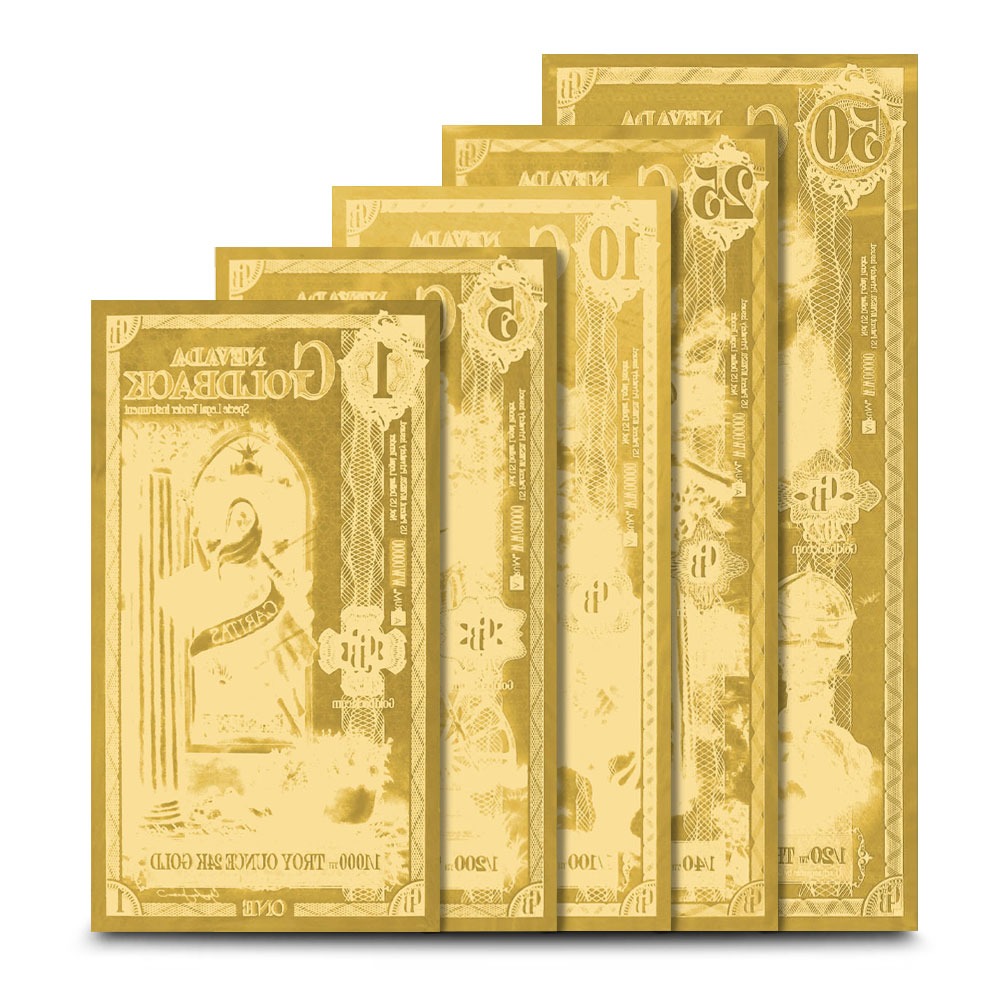 With your purchase of the 5 Piece Nevada Goldback Gold Note Set, notes will arrive in currency sleeves to preserve the value of each note. This set includes all 5 Nevada denominations which are the 1, 5, 10, 25, and 50 Goldbacks. Each bundle contains just over 1/11th Troy oz of actual gold content.