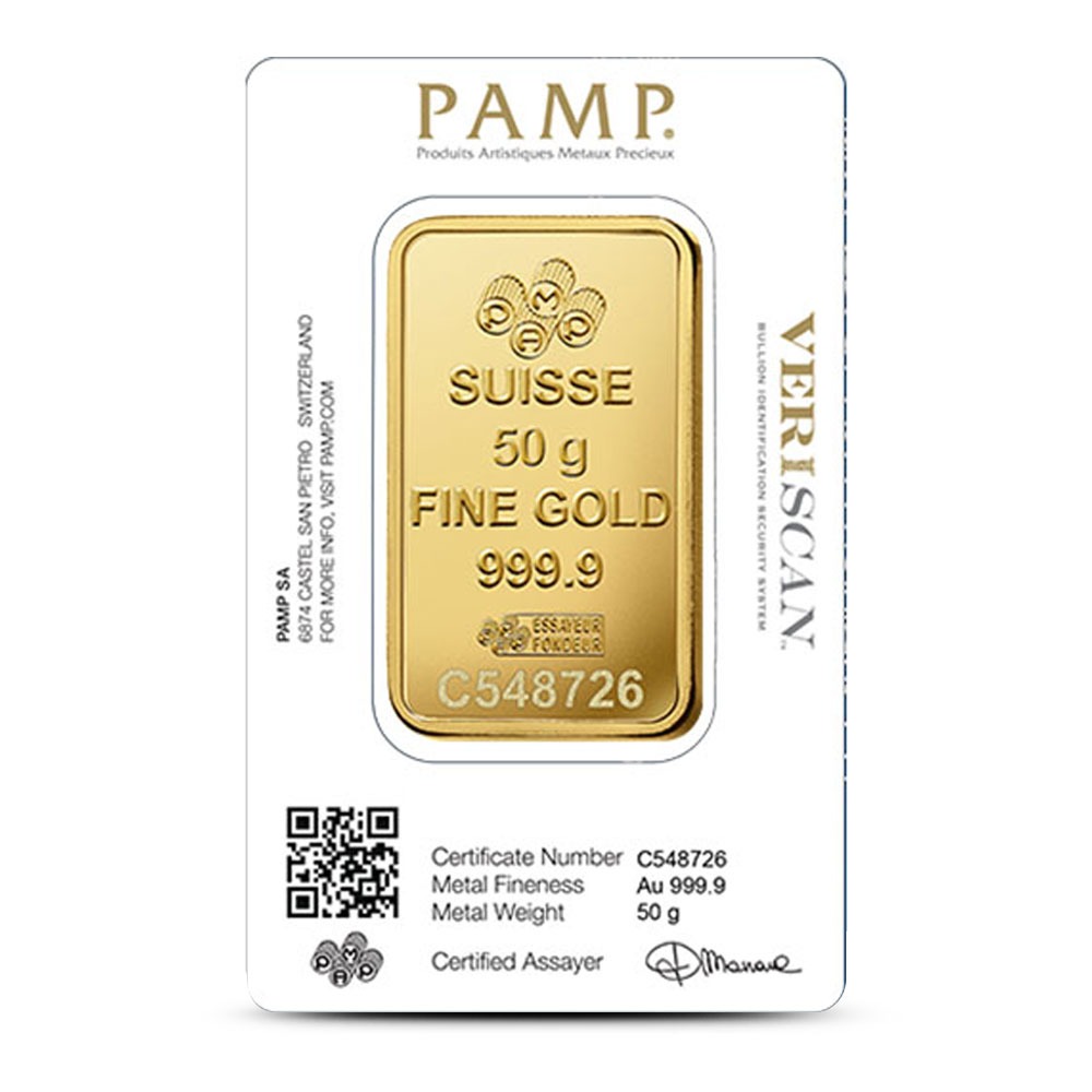 Veriscan technology from PAMP Suisse offers security and peace of mind to those individuals investing in gold from this leading global refinery. The sealed packages include a QR code on the reverse that can be scanned using PAMP’s mobile app that allows you to match up your 50 Gram Gold Bar with the PAMP Suisse registry of products it has refined and packaged.
