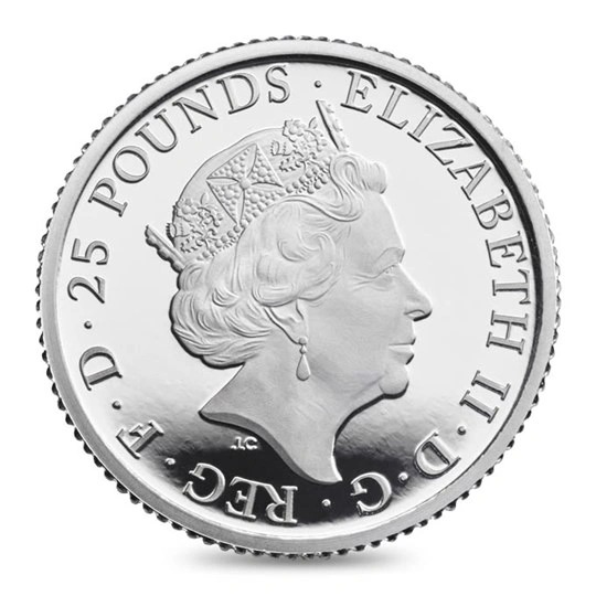 On the obverse is the fifth and most recent portrait of Queen Elizabeth II, first introduced in 2015. It was designed by the Royal Mint’s own engraver, Jody Clark, and you can see his initials just below the Queen’s neck.