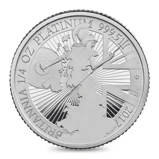 A 2017 Proof quarter ounce platinum Britannia coin from The Royal Mint.