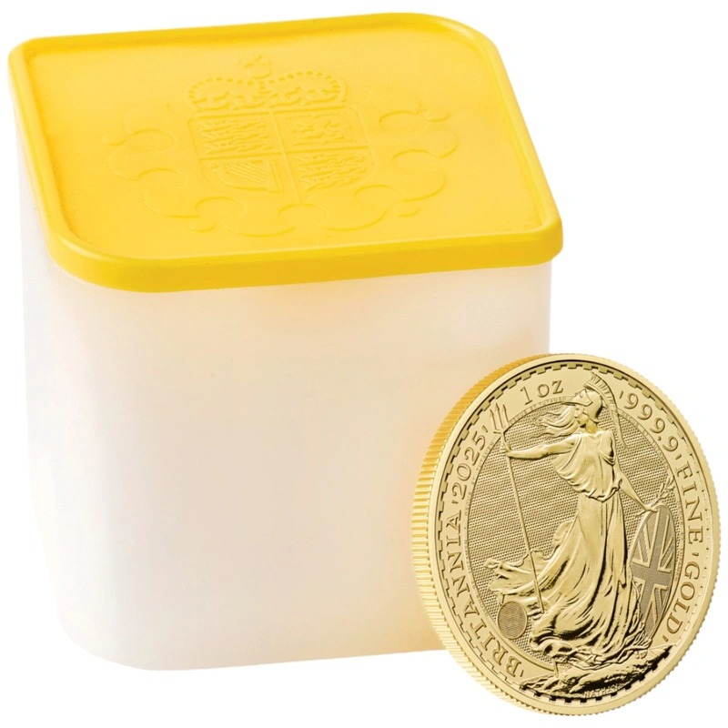 The 2025 Britannia 1oz is a British gold coin, minted by the Royal Mint. The weight of the coin is 31.21 grams with a fineness of 999.9 (24 carat gold), this means it contains 31.10348 grams of pure gold. The diameter of the coin is 32.69 mm. The 1oz Britannias have a face value of 100 Pounds and are legal tender in the UK.