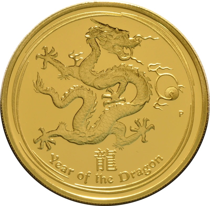 From the Perth Mint‘s Lunar Series, this 2012 gold Proof Year of the Dragon 3-coin set features a 1oz, 1/4oz and 1/10oz coin in a handsome wood box with certificate. All of the coins are struck in pure 9999 gold.